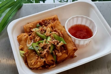 7 fried vegetable spring rolls with sweet chilli sauce. Topped with fresh spring onion and crispy fried onion.