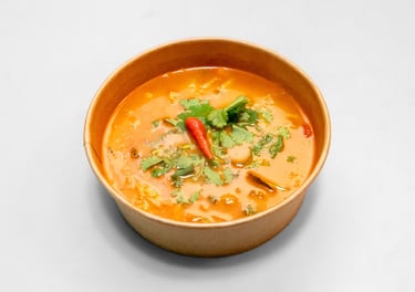 Aromatic hot and sour soup, made with lemongrass, krafir lime leaves, fresh lime juice. Topped with coriander and fresh chilli.